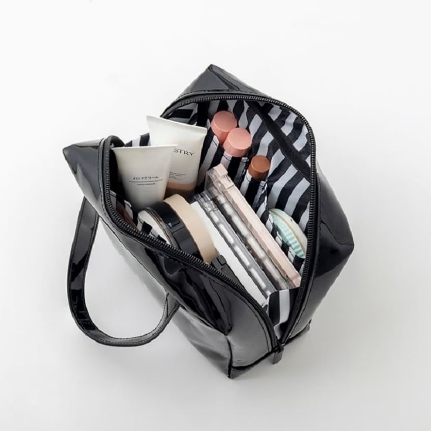💯全新➕正品 一款既實用而且質素高的雜誌附錄包 ✳️黑色亮面pu皮既防水又耐穢,容易打理 ✳️內𥚃為黑白條紋設計,非常有特色 ✳️大口袋設計方便放置和拿出物品 ✳️內有不同間隔:網口袋,內里袋和三個不同尺寸的收納格方便整理和收納不同物品 ✳️雙拉鍊設計也方便打開包包 ✳️長手柄設計也適合手挽和手拿兩用 尺寸:18*13*7.5cm 可放入350ml水瓶