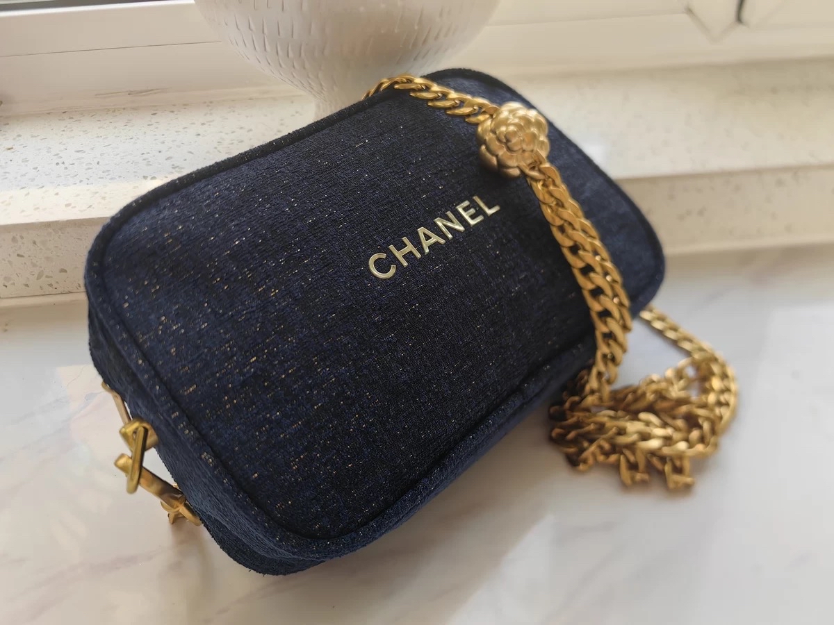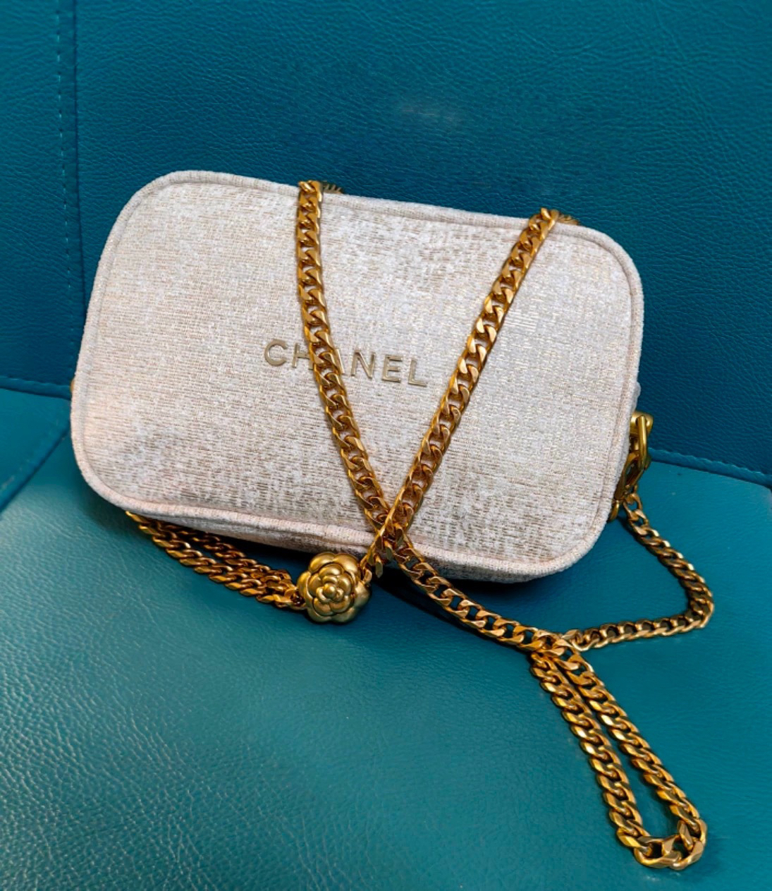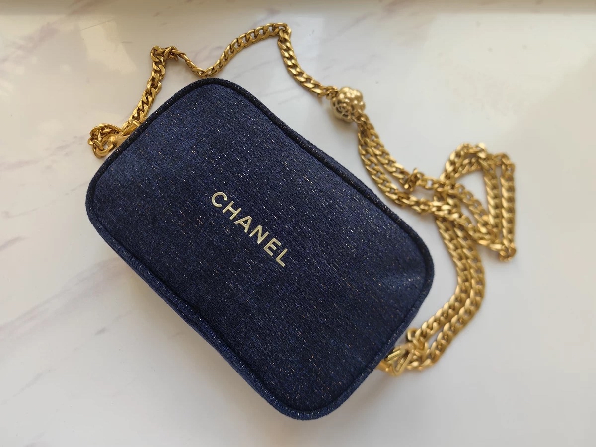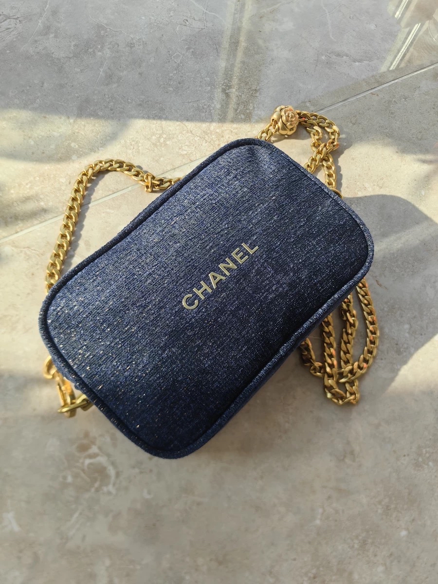 💯全新 💯正品Chanel Beauty 化妝包改造 藍金/白金化妝包配上花型金色條鏈肩帶,瞬間由一個化妝包變成能背出街的單肩包! 金包條鏈有份量,而且可調節長度,可調節成斜背或單肩,因應當日穿搭自由調節! 包包容量也友好,可放手機,小銀包,唇膏等,輕便出行 尺寸:19*12*5cm 兩款顏色選擇: 藍金 / 白金 正品化妝袋配已改裝成品數量不多,喜歡的建議入手一個,不然之後要自己組裝了🥲