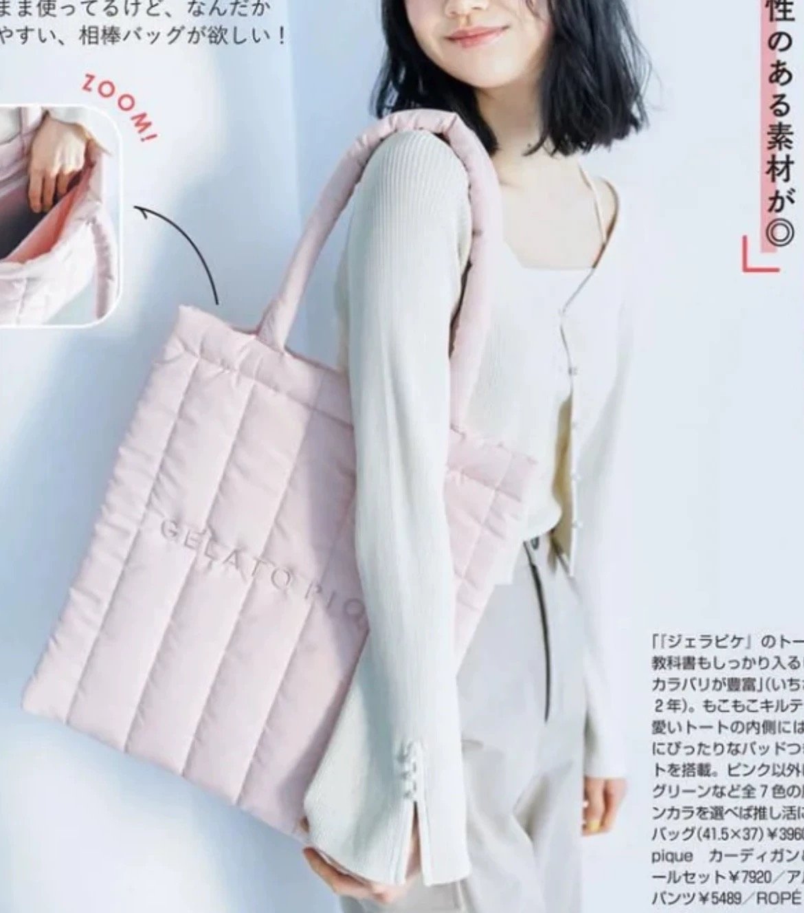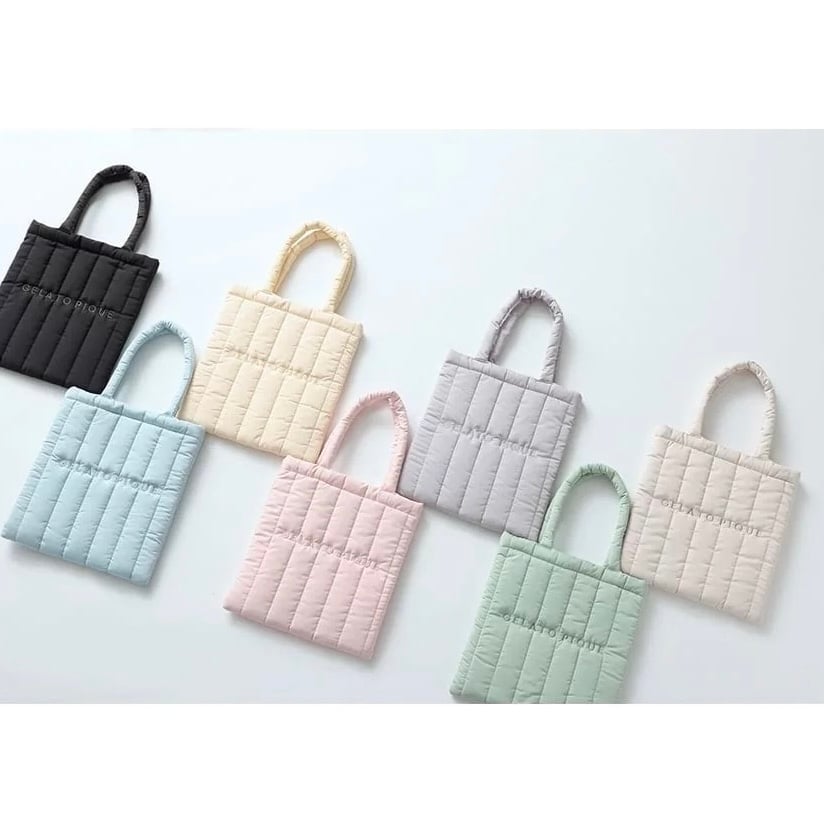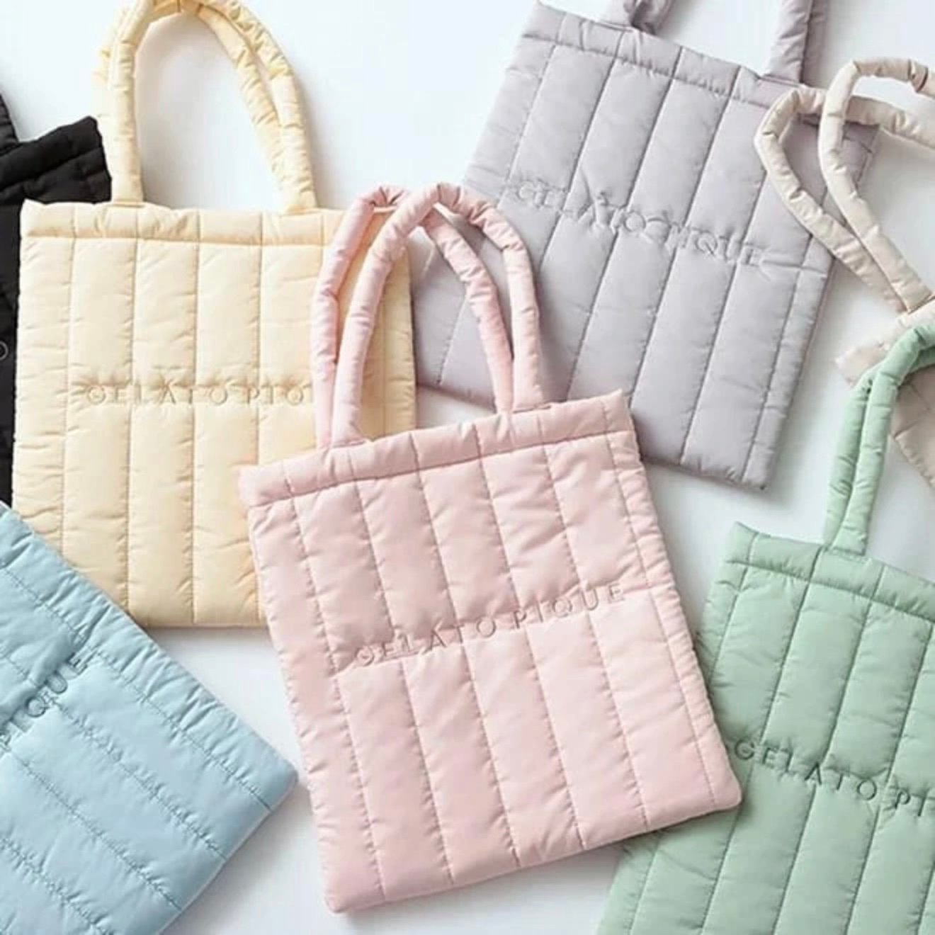 💯全新➕出口原單 日本限定 🇯🇵Gelato Pique出品的Tote Bag! 這款Tote Bag 採用近年十分流行的泡泡夾棉設計,質感非常柔軟舒服 👜 袋面層是直紋車線,配合夾棉內層,突出了立體感,加上有超美的7款馬卡龍顏色,真的是超美又容易配襯❤️ 裏面可以放到不少日常用品👍🏻 裏面有一空間收納手提電腦,還用了魔術黏貼固定,防止電腦跌出 袋面用上同色刺繡Logo,設計簡約同時有細緻感,不同風格的穿撘也能夠配合❤️ ✳️ 4色選擇:黑色/紫色/黃色/灰色 (⭐️米色/粉色/藍色或上述顏色可代做正品代購⭐️) 尺寸:37*41.5cm(手挽高25.1cm)